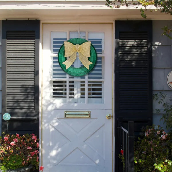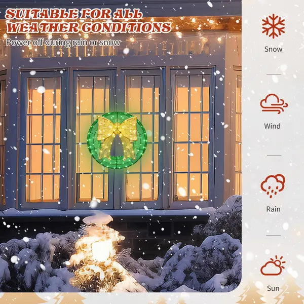 24in Pre-lit Outdoor Christmas Wreath Decoration, Lighted Metal Wreath With Golden Bow, Green And Warm White LED Lights, For Front Door Gate Wall Indoor Outdoor Holiday Party